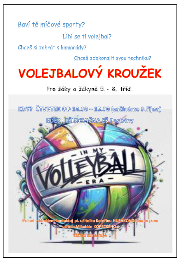 | Volejbalový kroužek | čtvrtek | 14:00 – 15:00 |
