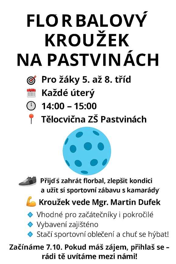 | Florbalový kroužek | úterý | 14:00 – 15:00 |